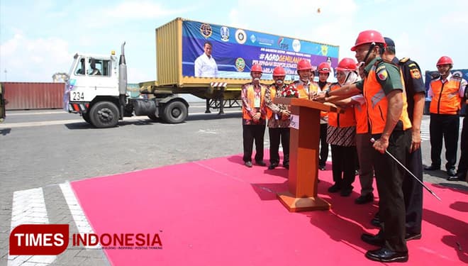 TIMES Jogja/Gubernur Jawa Timur. Dra. Hj. Khofifah Indar Parawansa saat melepas ekspor komoditi pertanian di Terminal PetikEmas Surabaya (TPS). Kamis (21/3/2019). (FOTO: TIM Media For TIMES Indonesia)