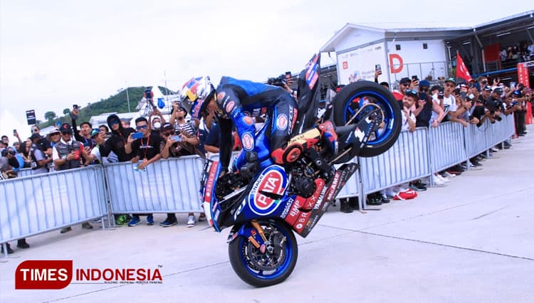 TIMES Jogja/Pembalap PATA Yamaha Brixx Toprak Razgatlioglu melakukan atraksi stopie ban depan usai memenangi race 1 WSBK Mandalika 2022, Sabtu (12/11/2022). (FOTO: Tria Adha/TIMES Indonesia).