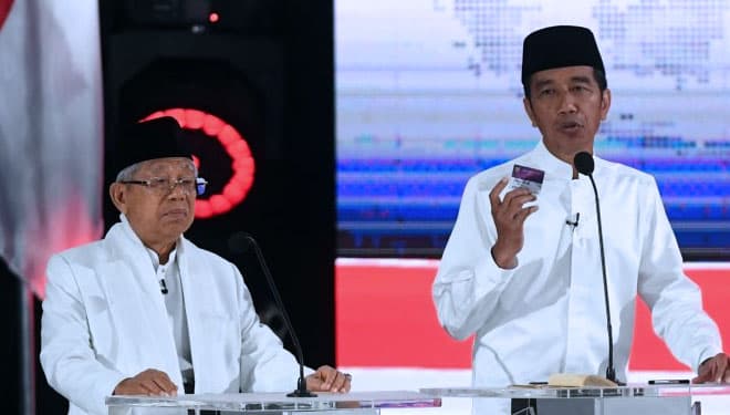 TIMES Jogja/Pasangan capres-cawapres nomor urut 01 Joko Widodo (kiri) dan Ma'ruf Amin mengikuti debat kelima di Hotel Sultan, Jakarta, Sabtu (13/4/2019). (FOTO: Wahyu Putro A/Antarafoto)